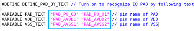 Tips2:推荐打开 “DEFINE_PAD_BY_TEXT” 开关,并写出对应项目中实际用到的 IO PAD 和 PWR/GND PAD, 请参考下图:(2025.12.12 updated)