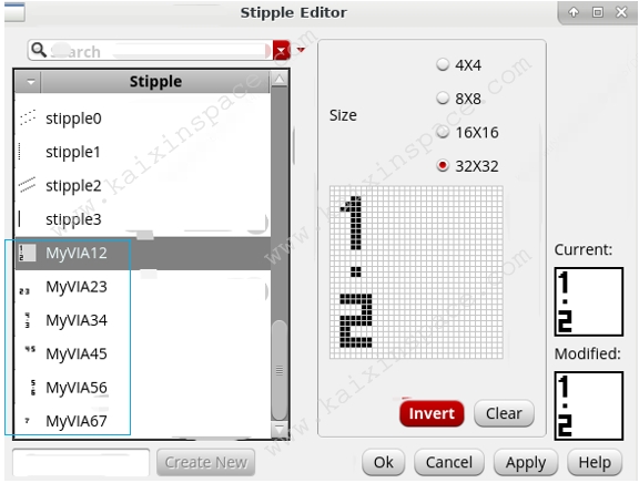 从 CIW 窗口,Tools — Display Resource Manager… 打开对应显示管理界面,找到 PDK 中对应的 Via显示layer,在右侧的 Stipple栏的下面点击 Custom…,按下图方式设置过孔内部的填充图案即可。非常方便版图绘制和查看,如下图所示: