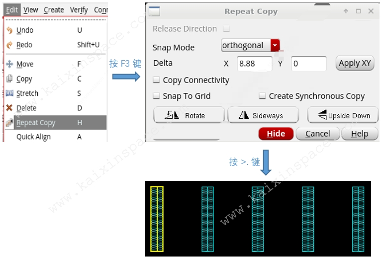 菜单栏 Edit-Repeat Copy,然后按 F3 ,在对应弹出的对话框中,设置对应的 XY 距离,点击 Apply XY 按钮。保持命令不变,回到 layout 界面, 按下 ” >. ” 按键,重复 copy , 按 u 键可以撤回。