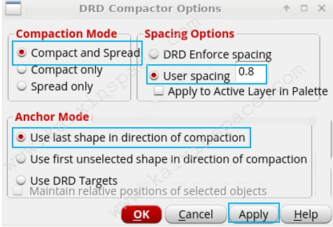 在 Layout XL 模式下,菜单栏 Options – DRD Compactor… ,先设置需要调整 bus 线的 spacing ,点击 Apply;然后在调出 DRD Compactor 相关操作图标,最后选择需要调整的 bus 线,点击对应操作图标即可。